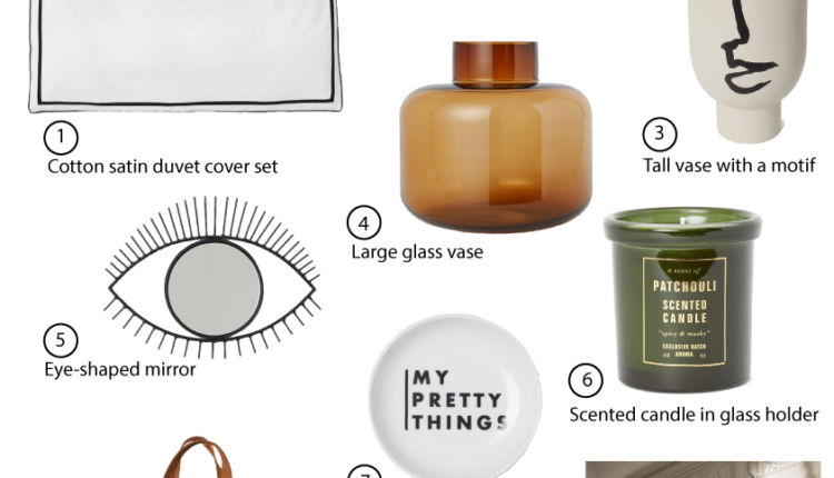1. Cotton satin duvet cover set (79,99 € + ) 2. Wooden hand mirror (14,99 € ) 3. Tall vase with a motif (24,99 € )  4. Large glass vase (24,99 € ) 5. Eye-shaped mirror (24,99 €) 6.  Scented candle in glass holder  (7,99 € ) 7. Porcelain soap dish  (2,99 € ) 8. Laundry bag (14,99 € ) 9. Porcelain plant pot (14,99 € )